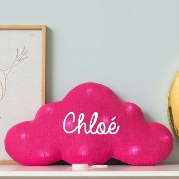 Avec la possibilité d'ajouter une option musique, dorlotez bébé sur la douce lumière tamisée de cette veilleuse en forme de nuage en lin de coton tout doux. Pour la décoration de la chambre de votre bébé ou pour un cadeau de naissance original, personnalisez-la avec son prénom ou un message de votre choix. Cette veilleuse peut être suspendue à son ciel de lumière grâce à un ruban assorti au tissu.